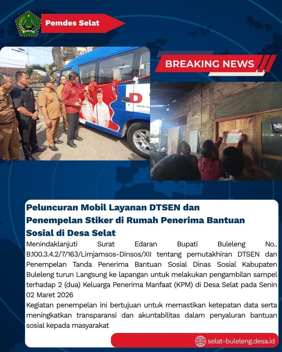 Menindaklanjuti Surat Edaran Bupati Buleleng No.. B.100.3.4.2/7/163/Limjamsos-Dinsos/XII tentang pemutakhiran DTSEN dan Penempelan Tanda Penerima Bantuan Sosial Dinas Sosial Kabupaten Buleleng turun Langsung ke lapangan untuk melakukan pengambilan sampel terhadap 2 (dua) Keluarga Penerima Manfaat (KPM) dan sekaligus peluncuran mobil layanan DTSEN di Desa Selat pada Senin 02 Maret 2026.